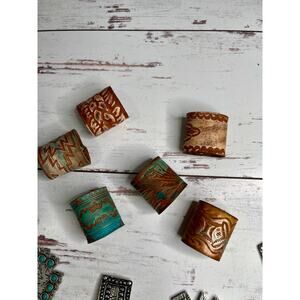 These are totally amazing! These can be used as a clip on your hat, a slide for your wild rag, a money clip, or even slide on your belt or your boot! These are totally cool! All leather slides will vary in color and tooling.