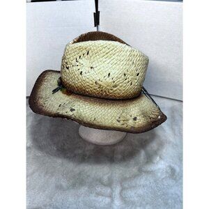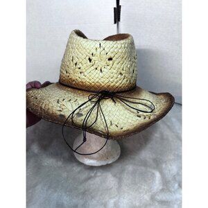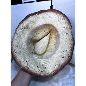This straw cowboy hat weaves tales of dusty trails and open skies. With its decorative bead trim and rugged texture, it conjures images of wild landscapes and adventurous spirits. It's a reminder of days spent under the sun, chasing horizons and living untamed. Embrace the journey.