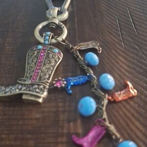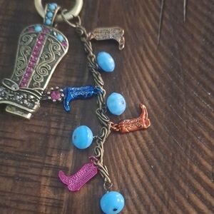Western Style Bag Charm Jeweled Cowboy Boot And Boot And Glass Charms. Large 2 1/2" boot charm with rhinestones. Antiqued gold-tone chain with glass beads and boot charms. Large antiqued gold-tone clasp. Hangs 6 1/2".
