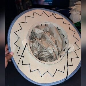 Classic western cowboy hat crafted from soft faux suede material. Features distinctive zigzag brim detail and decorative whipstitch crown stitching. Perfect for both casual wear and western-themed events. Includes adjustable chin cord for secure fit.May arrive with slight wrinkle and shape while in shipment but can easily be bent back into shape or steamed.