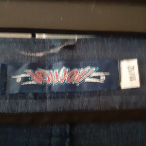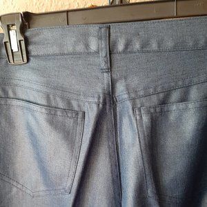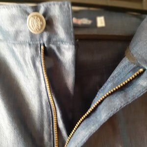 These pants are made from a specialty fabric called metallic blue-black polyester. It is has a blue and black sheen to it. It is western style (jeans), faux front pockets, and back pockets. It is a size11/12. The waist is 34" , the length from waist to hem 42" and the in seam is 32". The pants are brand new, never worn. There is however tiny pinhole on the left leg. There is a picture of it above. It is an imperfection in the fabric. Great looking color!