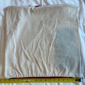Vibrant pillow cover with a western/aztec design. Features red, blue, black, and white colors. Made with 100% cotton and felt, handmade in India. Approx 17” by 17”