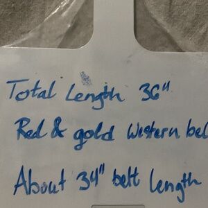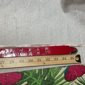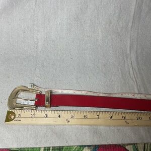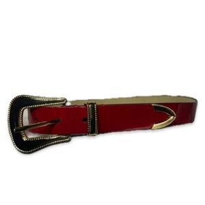 Keywords: red faux leather belt, gold accent belt, stylish accessory, versatile belt, statement belt, fashion belt.