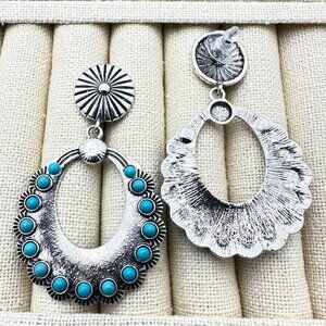 Elevate your style with these Western-inspired chandelier earrings. Featuring a silver tone with blue faux turquoise accents, they add a touch of elegance to any outfit. Perfect for any occasion and easy to pair with your favorite looks.