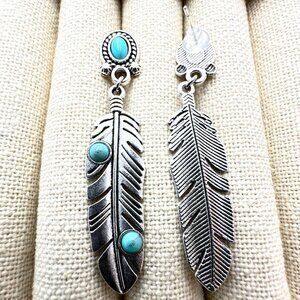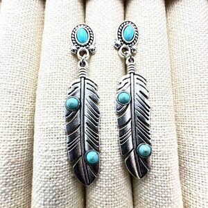 Western Style Silver Tone Feather Pierced Earrings Blue Faux Turquoise 2 Inch
