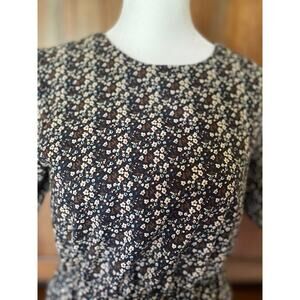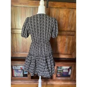 Cute western-style cowgirl dress in black, brown, and cream-patterned fabric. It has a tiered skirt and short sleeves, with an elastic waist.