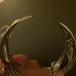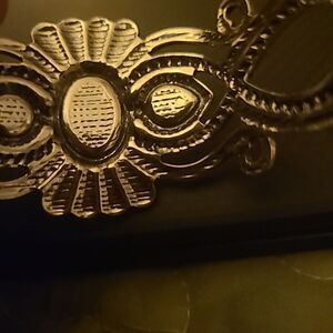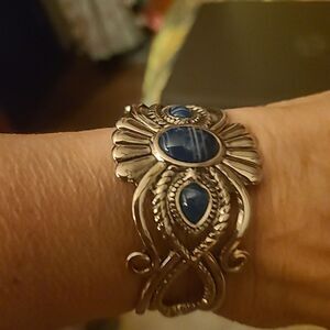 Pre-owned in good condition. Silvertone cuff bracelet with dark blue cabochons.