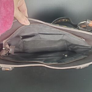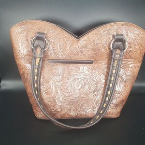 This beautiful Western tooled tote handbag features an embossed floral design, dark brown trim, stud accents, and a striking turquoise concho with long fringe detail. The wide structured base, reinforced shoulder straps, and roomy interior make it both durable and stylish. Perfect for everyday use or as a statement piece for Western, rodeo, and boho-cowgirl outfits.