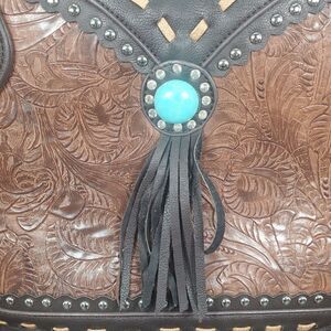 Western Tooled Brown Tote Bag w/ Turquoise Concho & Fringe – Shoulder Purse