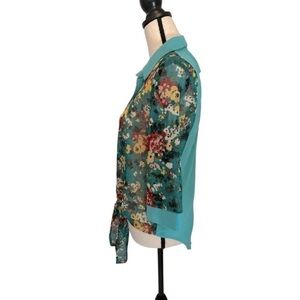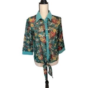 Western Top Button Up Turquoise Floral 3/4 Sleeve Open Back Beading Medium
