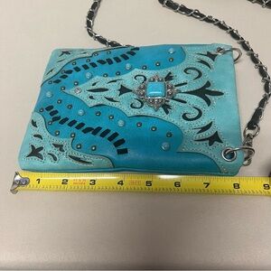 Western Turquoise Blue Studded Crossbody Purse Chain Strap Faux Leather Compact. Great pre-owned condition, normal signs of light use. Perfect size for phone, ID and some cash. Button closure.