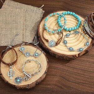 Features: This stunning set includes 4 layered western necklaces, 9 turquoise bracelets, a turquoise belt, 2 pairs of hoop earrings, and 8 knuckle rings. The distressed surface adds a trendy vintage vibe, and the turquoise stones are inlaid with various styles for a vibrant, bohemian flair.