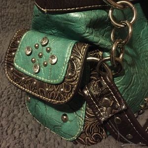 Western Turquoise Rhinestone Purse. Like new. Has 2 side pouches on each side. Zipper closure with two large compartments separated by a zipper compartment. Small zipper compartment on back of Purse and inside Purse.