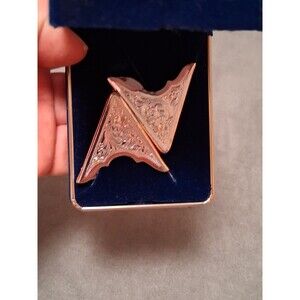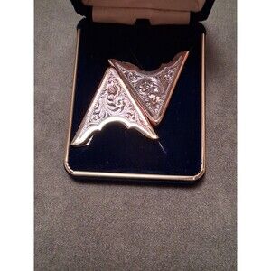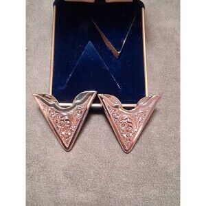 These vintage Western-style collar tips are a striking example of mid-20th century Western Americana jewelry. Crafted from silverplate, each piece features intricate floral and scrollwork engravings that showcase the detailed craftsmanship typical of Western motifs. The pointed triangular design with scalloped edges adds a distinctive flair, perfect for enhancing a Western shirt or jacket collar. Marked "Silverplate" on backs, and presented in a classic blue velvet-lined box stamped with "Montana Silversmiths".