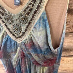 Western Wear Brand Dress. Multicolored. Beading details on chest area. Preowned. Size Large. Armpit to Armpit measures 17 resting and stretches to 21 inches. Dress is approx. knee length