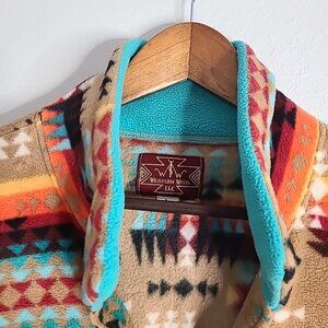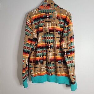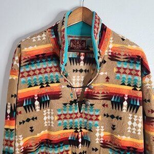 This Western Wit pullover jacket is perfect for any outdoor enthusiast who loves a touch of Southwestern boho style. Made with soft fleece material, this pre-owned jacket features a colorful Aztec design that is both eye-catching and unique.