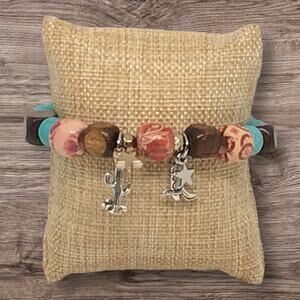 Western Wooden Howlite Beads Stretch Bracelet Boots & Spurs Charms Cowgirl