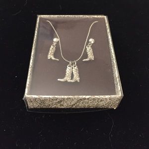 Windsor House Equestrian & Western Jewelry silver plated 16" necklace & pierced earrings with gold posts. Standard earring push back holds in ear. Packaged in gift box with clear lid. Consider bundling to take advantage of the discount & spread freight.