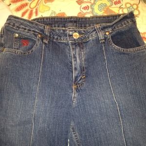 Low rise, long inseam. Light stretch. Line down the leg gives a long, lean look
