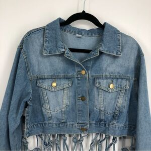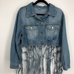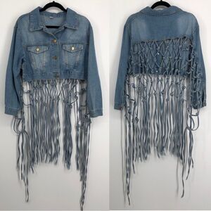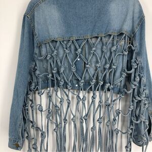 Crop soft denim jean jacket with knotted braid netting back. Size womens Medium.