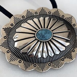 TAGS: concho hair tie western western hair turquoise stone silver repoussé handcrafted hair accessory frontier trading post jewelry cowgirl desert jewelry tribal concho handcrafted