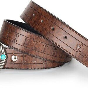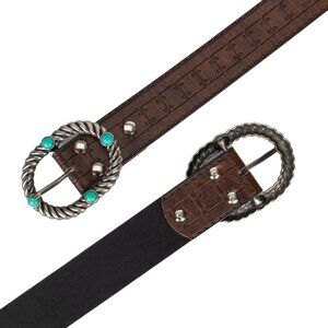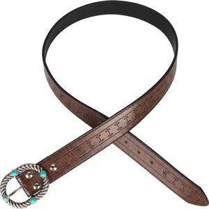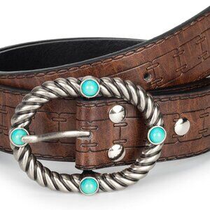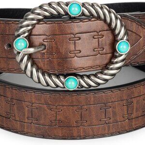Western-Leather-Belts for Women Turquoise-Oval-Buckle Embossed Cowgirl Belt for
