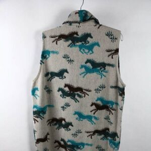 Long western theme with horses long vest by Mazmania Made in USA Acrylic and Polyester Blend. Sort of feels like a heavy flanel. Has stitching for additional detail and leather ties for closure.