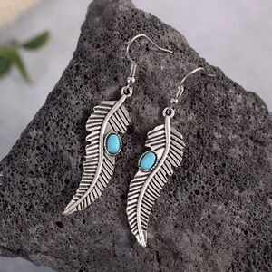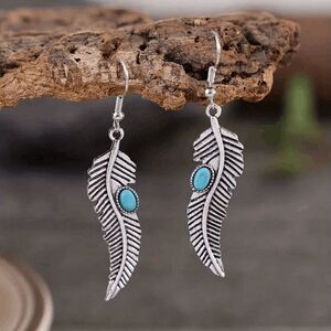 Chic Western Silver Turquoise Feather Dangle Earrings