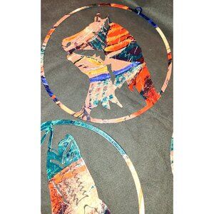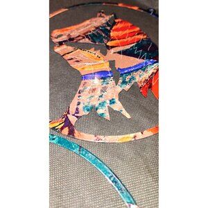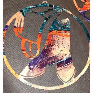 This set of intricately designed metal wall art pieces features western-themed motifs, including a horse and cowboy boots with a vibrant color palette. Suitable for adding a touch of rustic charm to any space, these pieces are crafted with precision, showcasing dynamic patterns and a sense of movement.