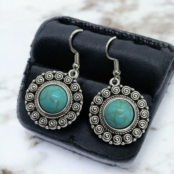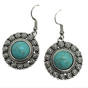 Western Turquoise Bead Silver Filagree Dangle Earrings Bohemian Tribal Jewelry