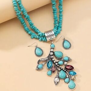 Elegant big stunning bold bohemian turquoise and silver pendant necklace set with matching earrings. Perfect for adding a touch of color to any outfit.
