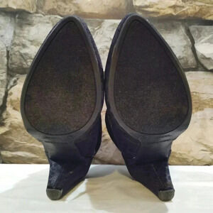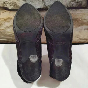 A pair of boots that have just the right amount of attitude! Material has a bit of sheen, 2-tone and eye-catching, enough to just catch the light. Sometimes I catch a bit of purplish. Look great with jet black. Outers show no tears or splits; some mild creasing. Note: Interiors show some flaking. Outsole is in used condition with some wear to heel caps. Please see pictures and video for further illustration. Video shows truest colors.