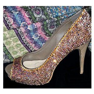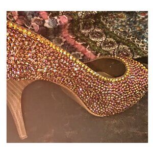 while the outer edges are trimmed in copper colored glass rhinestones.