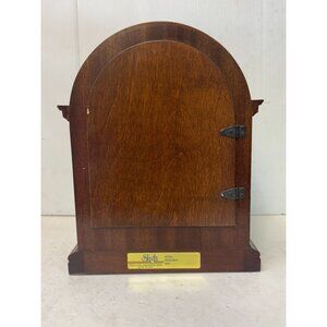 Mahogany finish on select hardwoods and veneers with an intricate oval inlay of variegated maples and madrona burl. The warm white dial features black numerals and hands, and a brass-finished bezel. Fluted columns with wooden column caps grace each side. Durable bronze bushings. A high-precision, German-made, key-wound, Westminster chime movement. Has key at bottom. FRANZ HERMLE Two (2) Jewels 340-020 Germany CHIME 0519-2-CM. Movement 2961. Made in west Germany. Sticker on back reads Sligh Holland Michigan made in USA. 11.5 inches tall. 9.25 inches wide. Depth is 5 inches.
