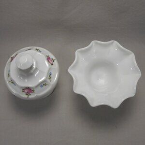 Westmoreland Hand Painted Milk Glass Lidded Pedestal Candy Jar + Ruffled Compote