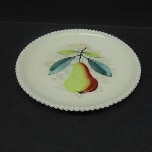This is a really nice milk glass Beaded Edge 7 1/4 inch hand painted Pear plate made by Westmoreland Glass. This plate is in very good condition with no chips or cracks. The hand painted Pear design is very good. Be sure to search our other Westmoreland Glass items available.