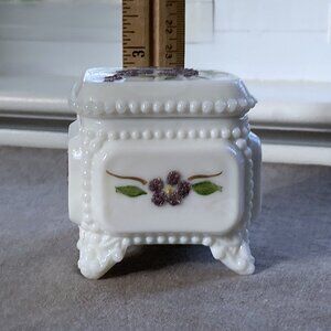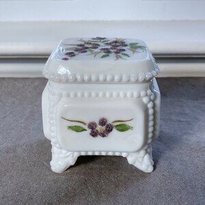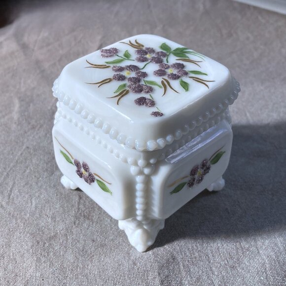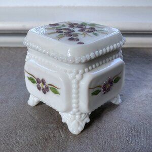 This charming vintage milk glass trinket box features a lidded, footed design with delicate hand-painted and sugared purple flowers with green leaves and gold accents. The raised beaded detailing around the edges and the ornate four-footed base give it true Victorian-inspired elegance.