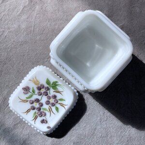 Made by Westmoreland Glass Co., this style of hand-painted floral milk glass was popular during the 1950s–1970s. Pieces like this were often gifted as dresser or vanity boxes.