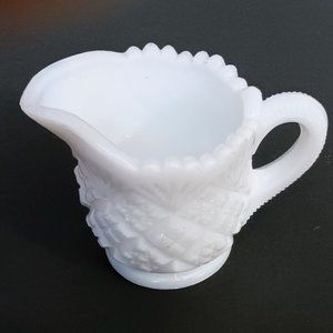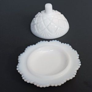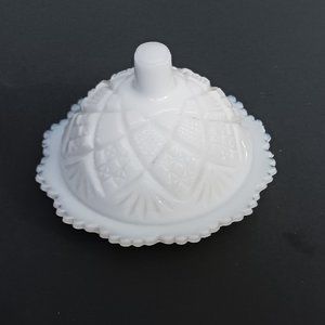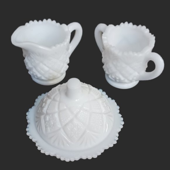 Westmoreland Thumbelina Milk Glass Child's Butter Dish w/Lid Creamer Sugar Bowl. Dish has tiny chip on one edge, see picture. Barely noticeable to the naked eye. Butter dish measures 3-5/8" diameter, 2-3/4" high. Creamer measures 2-1/2" high. Sugar measures 2-1/4" high. Interested, make an offer. From a smoke and pet hair free home. Fast, careful, actual weight shipping.