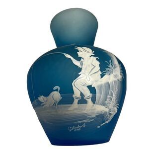 Westmorland Artist Signed 1971- Mary Gregory Vase Boy Fishing Blue Satin 7" tall