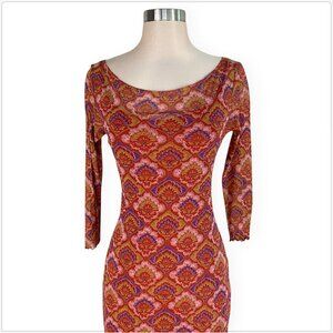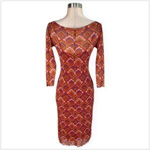 Dress has a separate slip dress lining. Sheer overdress has 3/4 sleeves. Midi length. Lettuce edge hem and sleeve cuffs. Bodycon stretch style. Gorgeous medallion type pattern in rich fall or autumnal tones.