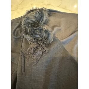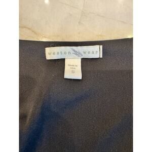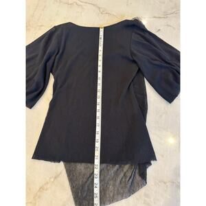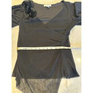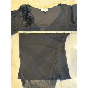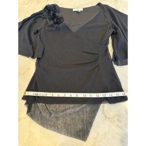 Weston Wear Whimsygoth Faux Wrap V-neck Flutter Sleeve Mesh Overlay Top Sz Small. Black on black mesh rosette accent. Solid Black surplice wrap bodice with super soft nylon mesh overlay with an asymmetrical hem. The V-neckline and waist-defining crossover are universally flattering and compliments many body shapes! Eye catching! 100% Polyester. Approximate measurements: