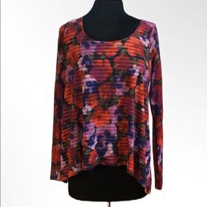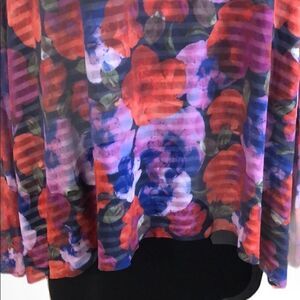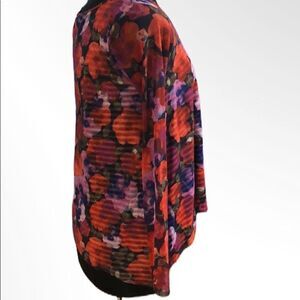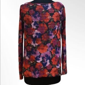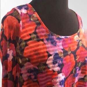 Beautiful Weston sheer bright floral mesh over black and white striped lining. Long unlined sleeves. Crew neck. Gently used condition.