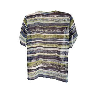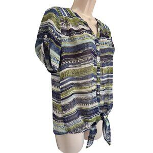 This semi-sheer button-up from Westport features a tie waist and stylish blue-green stripes. Perfect for adding a pop of color to any wardrobe, it offers a flattering fit for petite medium sizes and is in excellent used condition.
