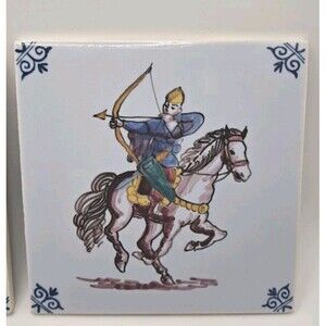Set of 2 authentic Westraven Delft tiles, marked "Anno 1661." Each tile features a hand-painted medieval-themed scene: one with an archer on horseback, the other with a siege on a castle tower. Traditional Dutch corner motif in blue. These collectible ceramic tiles were made in Utrecht, Netherlands, likely in the mid-20th century. Ideal for framing, decor, or Dutch pottery collectors.