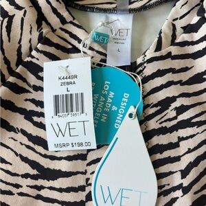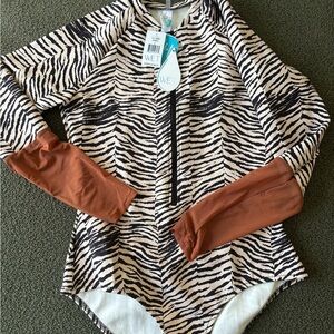 Stylish zebra print swimsuit with long sleeves. Features a front zipper and contrasting brown cuffs.