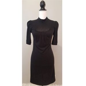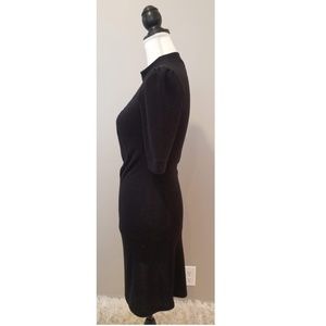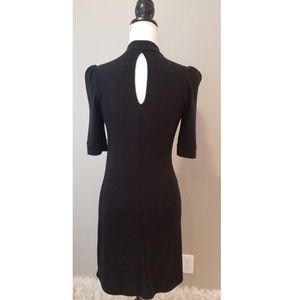 Very soft, knit dress with lots of details - mock turtleneck neckline, gathered sleeves and bust add extra femininity, sleeves that hit just around the elbows, and keyhole back. Lots of accessorizing possibilities! There is some pilling of the material since it is a soft knit, which you can see in the third picture, but it's not very noticeable except up-close. Labeled size Small, but would also fit X-Small well.