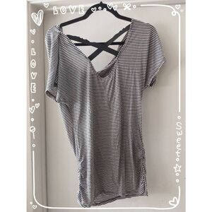 This cute top is from Wet Seal was worn once. Done in soft blue and white stripes, it has a boat style neck and ruching at the body. The front has a pretty floral design and The back has an elastic "X" design. It is size Large, measures 28" in length from the top of the shoulder to the bottom hem and 15" across from armpit to armpit when laid flat. It is done in a soft cotton blend.