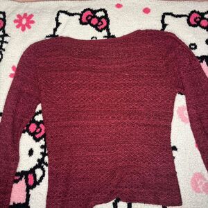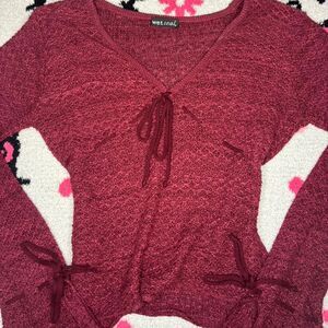 burgundy knit, tie front, fitted sweater, retro style, Y2K fashion, cropped fit, ruching detail, cozy winter, casual chic, small fit