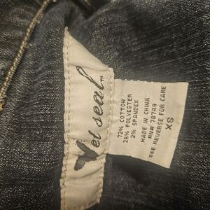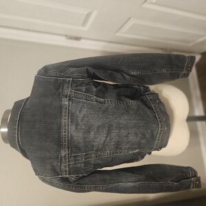 Stylish dark blue jean jacket. Features classic button-up front. Two chest pockets with button closures. Perfect for casual wear.